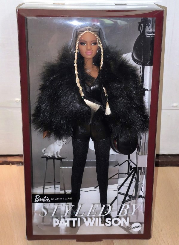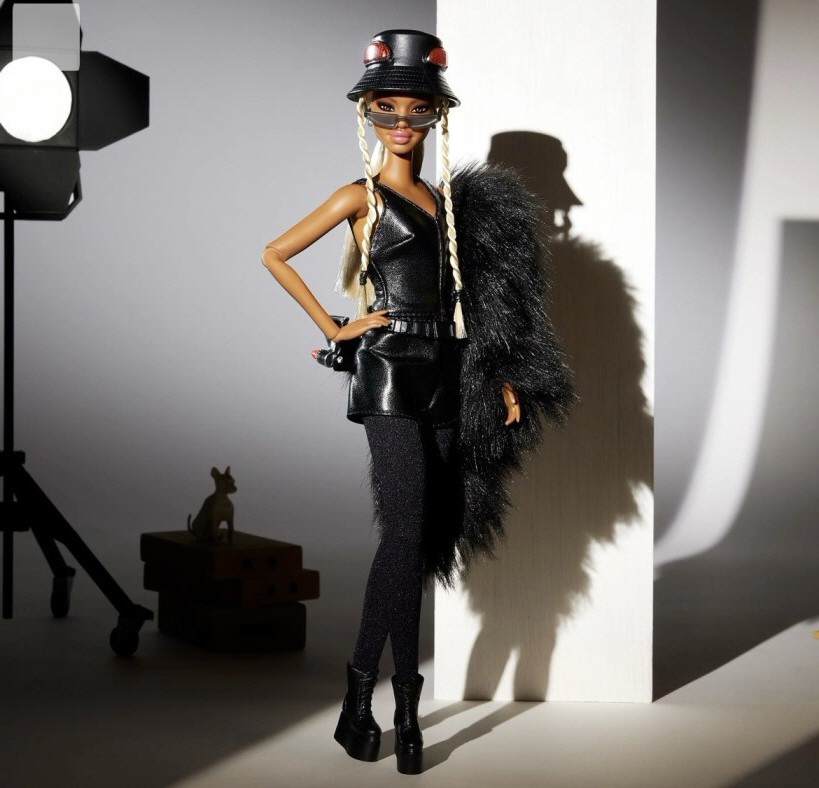 Barbie goes big, bold, and unexpected, with a mix of fabrics and textures, in a stunner that showcases Wilson’s expertise at crafting eclectic yet cohesive styles. Her look is accessorized with earrings, sunglasses, and a spectacular belt with “Barbie” license plate. The bucket hat and braided hair add extra creative touches.