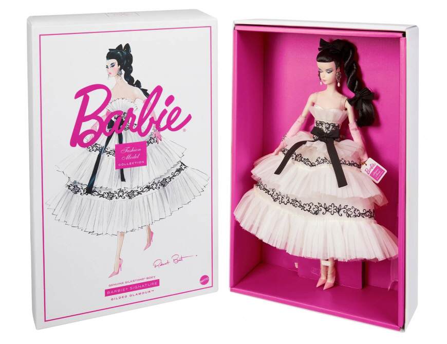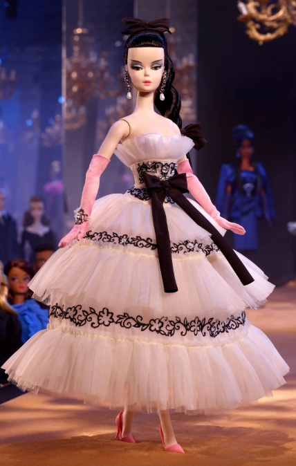 Chic and alluring, the fourth addition to the members-only Barbie Fashion Model Collection is a vintage-inspired vision. Her timeless yet unique look features a full cage crinoline, made even more dynamic by cascading layers of white organza and a tulle-ruffled trim for extra volume. Black floral embroidery and tiny crystals add visual depth to the skirt, and her matching pink satin opera gloves and pumps add a pop of color to the otherwise monochromatic ensemble. Silkstone body