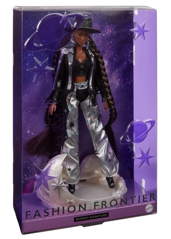 Barbie shines in a night-sky inspired look, with a black crop tank, shimmering fringed cape, and matching silver starburst-patterned chaps. She elevates the celestial style with a rhinestone-buckle belt, leather arm cuffs, and a wide-brimmed hat that instantly rocket her to star status.