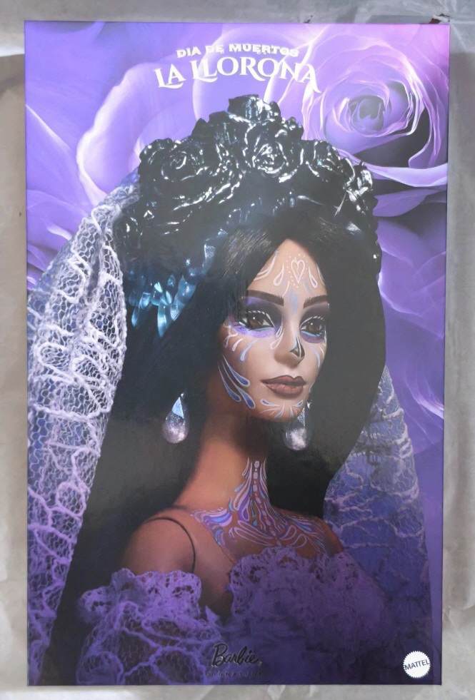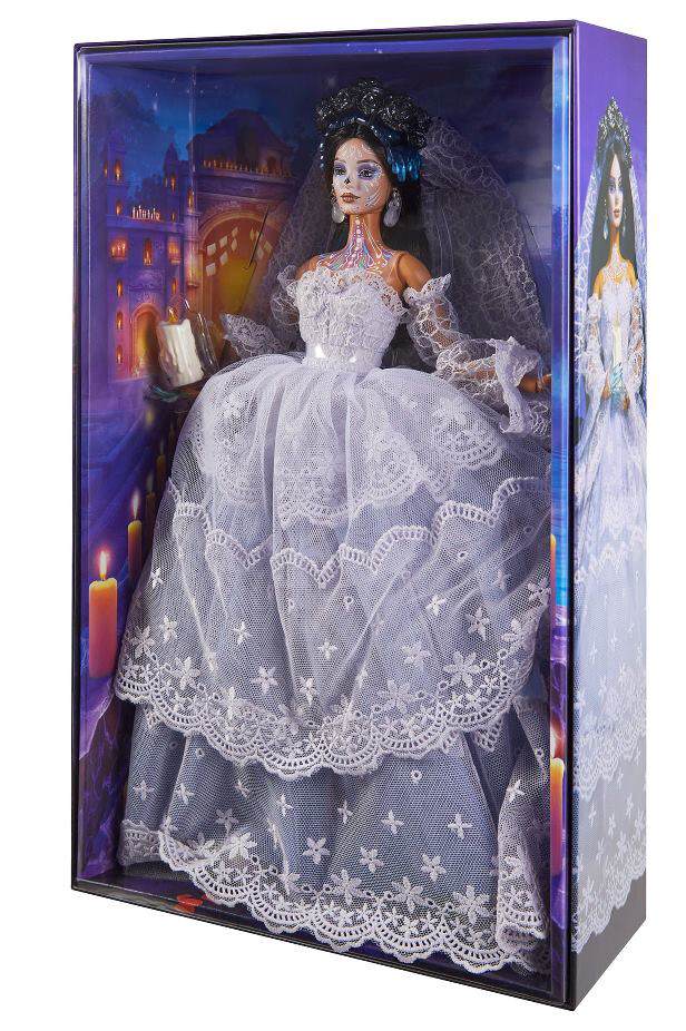 Hauntingly draped in white lace, this legendary figure of Mexican lore returns as a gorgeous Día De Muertos Barbie. A ghost story passed down for centuries, La Llorona comes to life in a tiered gown with a corset bodice, blue underskirt, and sleeves that envelop her translucent blue hands, decorated in a skeletal holiday design. This weeping woman is thought to return on this day, and she’s adorned for the occasion with a striking black rose headdress and lace veil, plus traditional face makeup.
