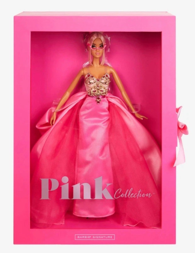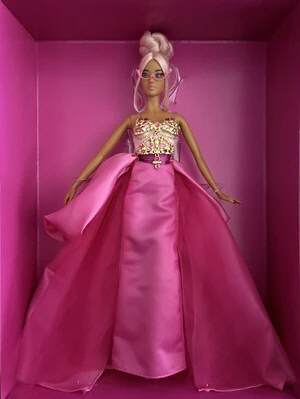 The fith and final Barbie in the collection. Classic Barbie glamour meets trendy fashions. She is the first Asian Barbie from this series and makes a stunning debut in a completely pink outfit with a satin skirt and a golden top on which the pink stones glitter. Her look is rounded off by a blonde updo with pink strands, sunglasses with floating lenses and see-through pink mules. With Silkstone body