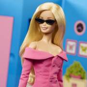 Barbie as White Gold Fortuna wears a stunning gown, showcasing the Odile face sculpt with flowing silver hair. Her look features a white and gold color palette, with ornate filigree embroidery, pleated panels, and a dramatic front slit. A crown of golden medallions, matching jewelry, and gilded heels complete this regal, goddess-inspired design.