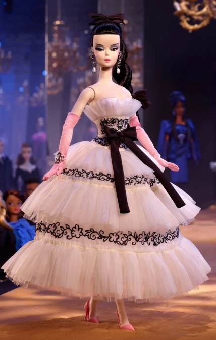 Chic and alluring, the fourth addition to the members-only Barbie Fashion Model Collection is a vintage-inspired vision. Her timeless yet unique look features a full cage crinoline, made even more dynamic by cascading layers of white organza and a tulle-ruffled trim for extra volume. Black floral embroidery and tiny crystals add visual depth to the skirt, and her matching pink satin opera gloves and pumps add a pop of color to the otherwise monochromatic ensemble. Silkstone body