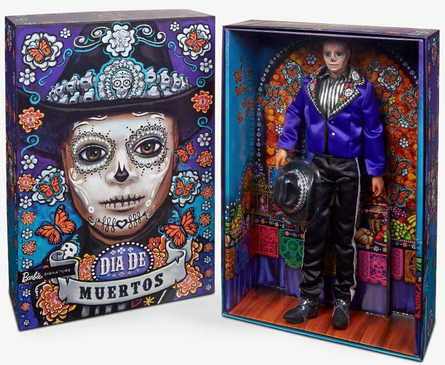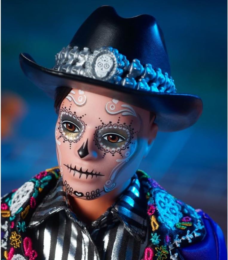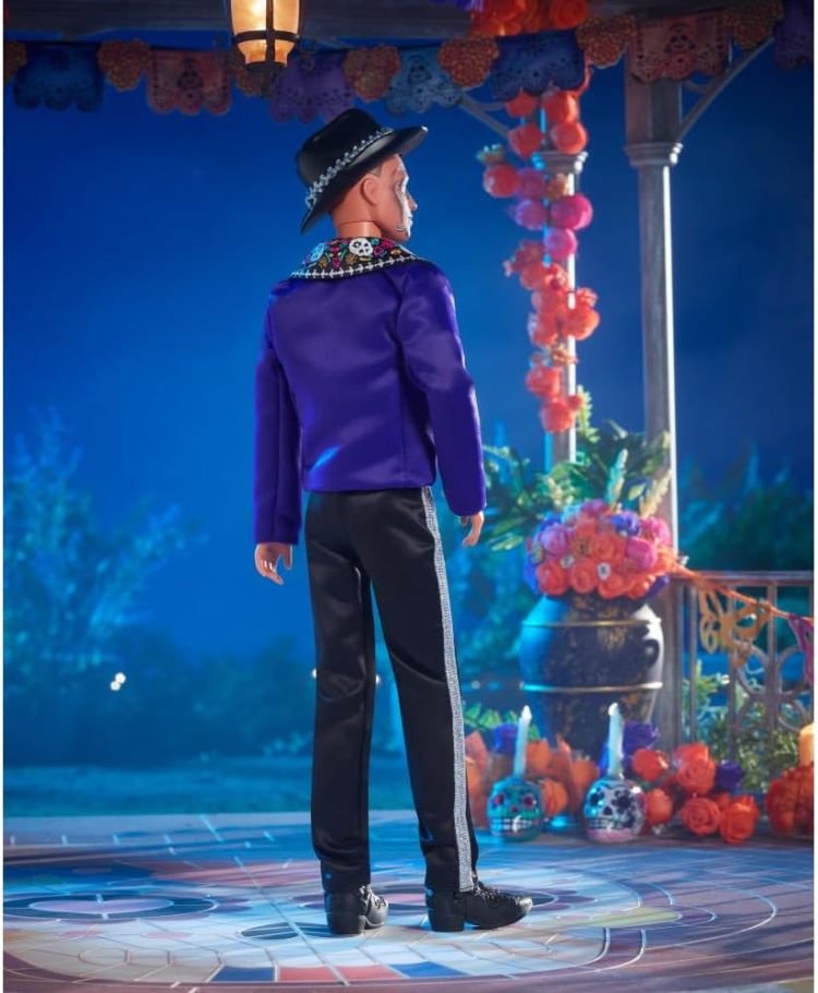 Barbie Día De Muertos series honors the customs, symbols, and rituals often seen throughout the festive time of remembrance. Ken doll is strikingly handsome in a blue jacket with embroidered bone details at the lapels. A sugar skull-accented hat frames his calavera face paint.