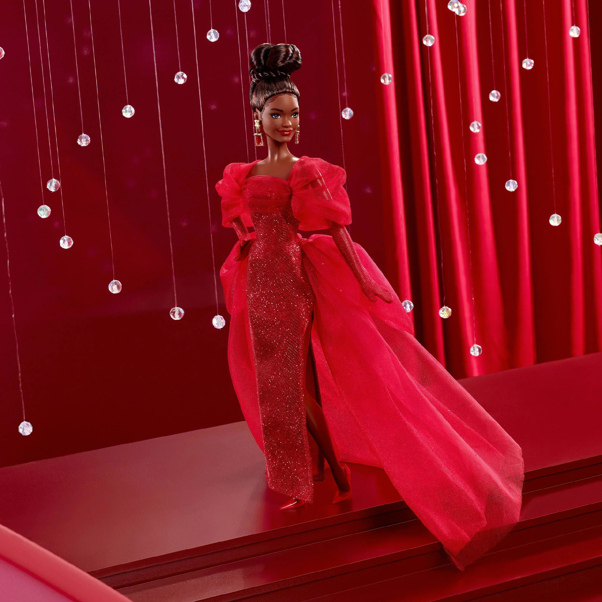 Eight decades of iconic toymaking warrants a special design to mark the occasion. Behold our Mattel 80th Anniversary Barbie a stunning keepsake that honors the legacy of a company that has inspired generations. She looks red carpet-ready in a glittery gown accentuated by bow-like sleeves and a dramatic tulle bustle. Ruby pumps complement her dazzling look, while red nails and drop earrings with a golden “M” pay stylish homage to the old-school Matty Mattel logo.