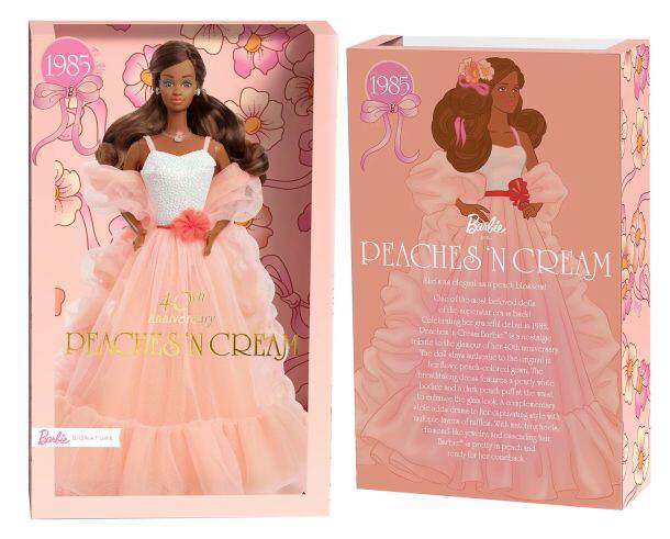 Vintage reproduction of the much-adored Peaches ’n Cream Barbie fashion will bring back all those nostalgic vibes. Featuring a shimmering cream bodice and a voluminous ruffled peach skirt that flows to the floor, Barbie magically captures the romantic, feminine vibe that defined '80s aesthetics. Finished with a chiffon stole and delicate blossom bow, her fairy-tale look is pretty as a peach.