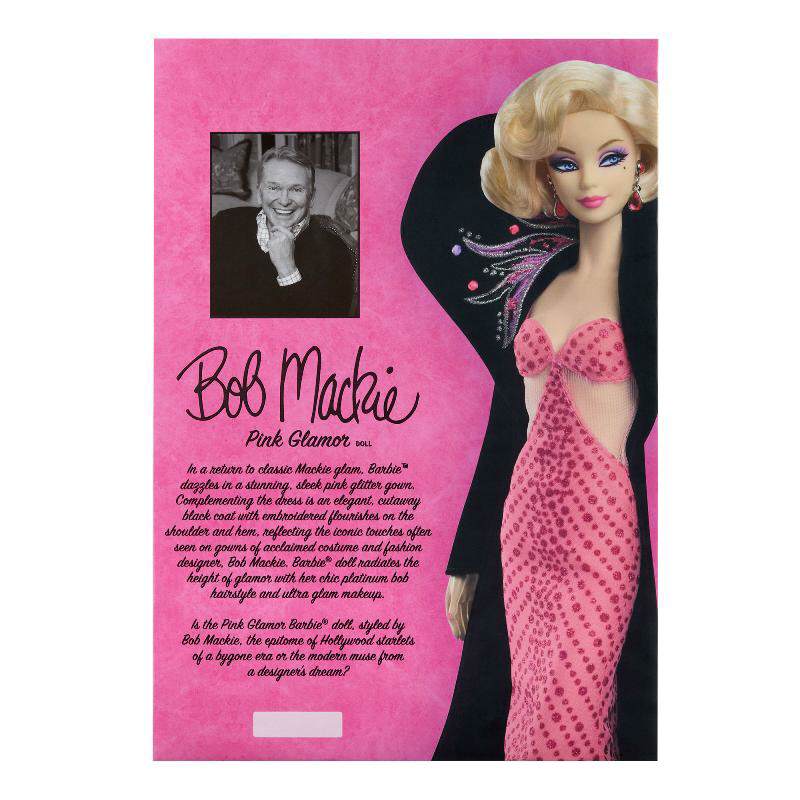 Renowned fashion designer Bob Mackie is back with another glamorous Barbie. She is the embodiment of “Pretty in Pink,” combining modern muse with the glamour of Hollywood's golden age. Her evening gown echoes Mackie's style and is complemented by an elegant, dramatic coat with intricately embroidered hem and shoulders. With her platinum blonde bob and extra-glamorous makeup, this Barbie is a true fashionista.